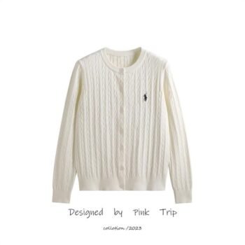 Ames pony embroidery old money style knitwear coat women’s twisted yarn autumn white Fried Dough Twists sweater